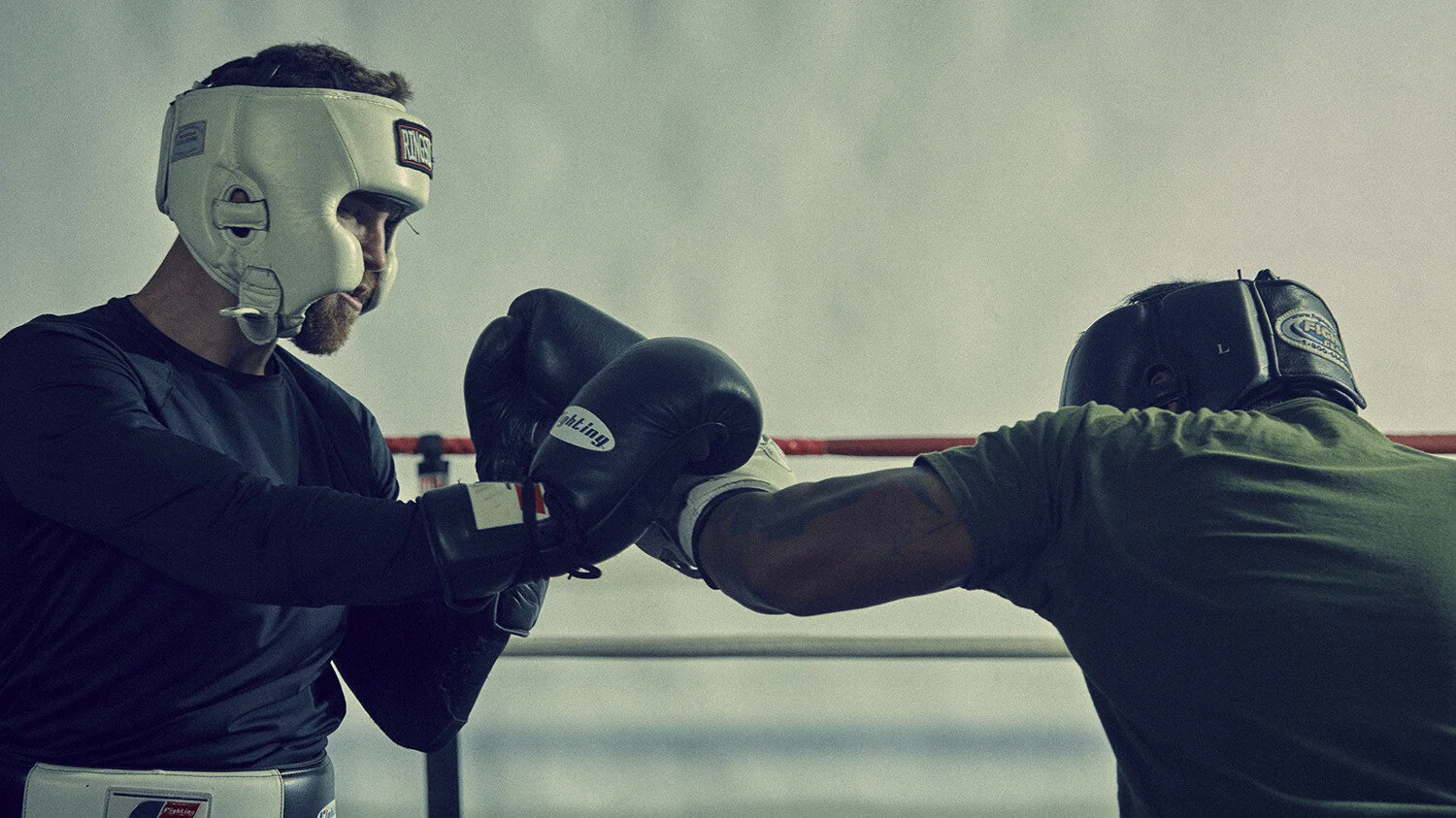 Two men sparring in boxing gym, one wearing a white headguard and black gloves, delivering a punch to the other's black headgear, with a boxing ring in the background.